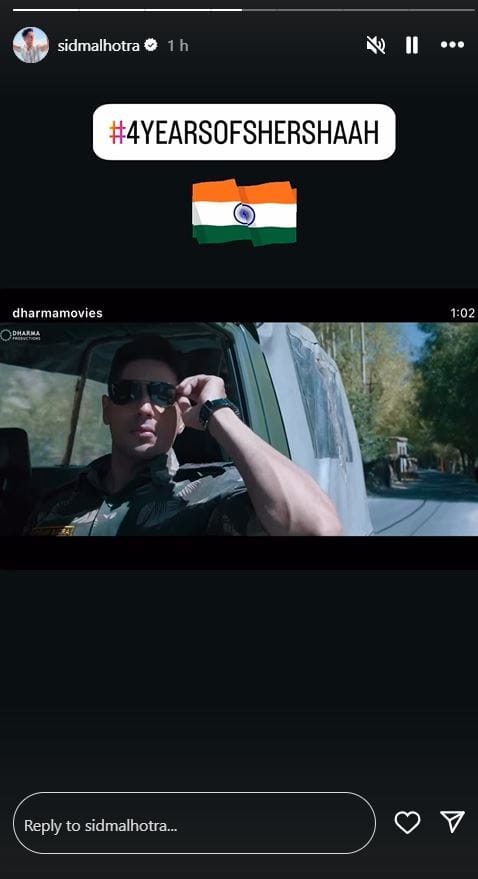 बॉलीवुड अभिनेता सिद्धार्थ मल्होत्रा ने अपने इंस्टाग्राम अकाउंट की स्टोरी पर दो पोस्ट शेयर किए हैं, जिसमें उन्होंने ‘शेरशाह’ फिल्म के चार साल पूरे होने पर संदेश भी लिखा है। पहली स्टोरी में अभिनेता ने धर्मा प्रोडक्शन द्वारा शेयर किए गए वीडियो को लगाया है, जो ‘शेरशाह’ फिल्म का क्लिप है। इसके कैप्शन में प्रोडक्शन हाउस ने लिखा, ‘एक बहादुर सिपाही की सच्ची कहानी, जिसने देश के लिए लड़ाई लड़ी और पीढ़ियों तक अपनी छाप छोड़ी। ‘शेरशाह’ के हिट गानें और शानदार डायलॉग्स को चार साल पूरे हो गए।’
