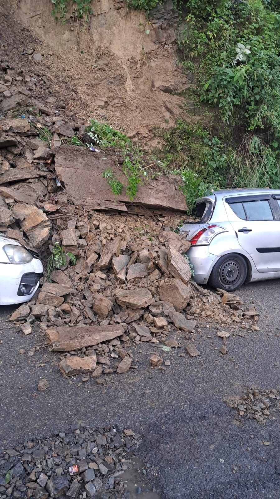 शिमला शहर के टुटू में भूस्खलन, दो गाड़ियां दबीं, भवन को खतरा