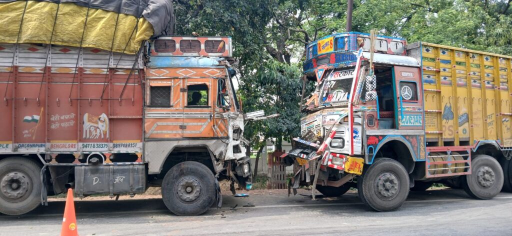 हनुमान चैकी के सामने दो ट्रकों आमने-सामने से भिडे