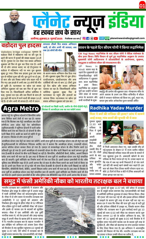 वडोदरा पुल हादसा: लगातार तीसरे दिन बचाव अभियान जारी, दो लोग अभी भी लापता; अब तक 18 लोगों की मौत July 11, 2025 No Comments